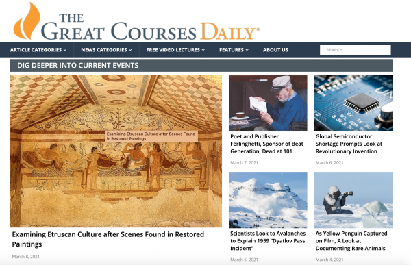 “Here at The Great Courses Daily, we carefully curate the same materials created for our video series in order to bring you highlights, features, and articles in an accessible, easy to digest manner. With meticulous attention to maintaining editorial guidelines and academic rigour, we provide you a sampling of articles, videos, images and most of all, the vital information from our courses.”